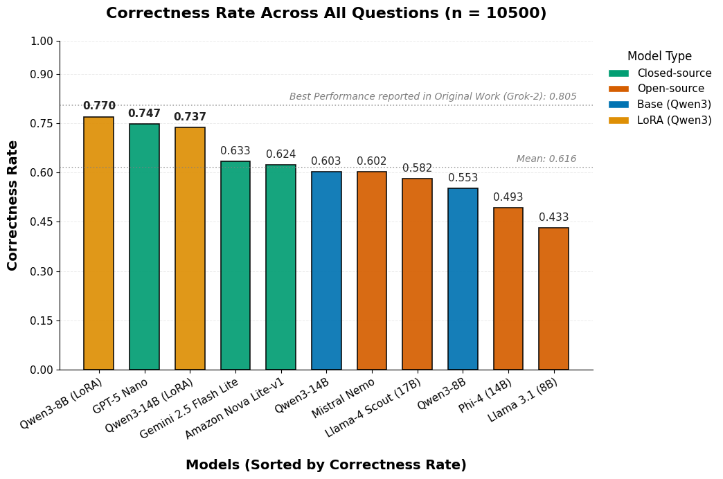 The LoRA-tuned8Bmodel outperformed the tuned14Bmodel on SA metrics, suggesting a favorable path for on-device deployments. -