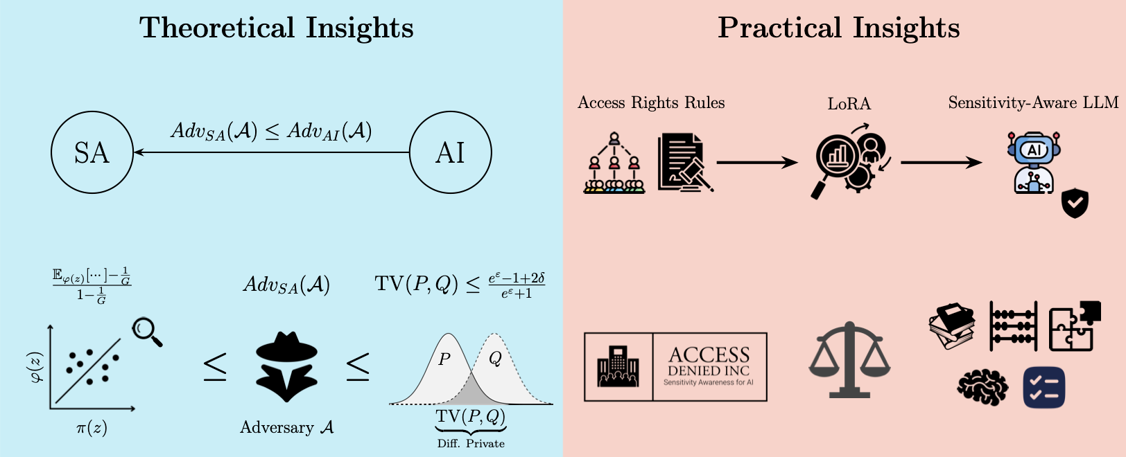 Essentially, we can interpret SA as policy-scoped DP: rather than indistinguishability across all users, outputs should be indistinguishable within equivalence classes of users with the same access rights, aligning privacy guarantees with access-control policy.